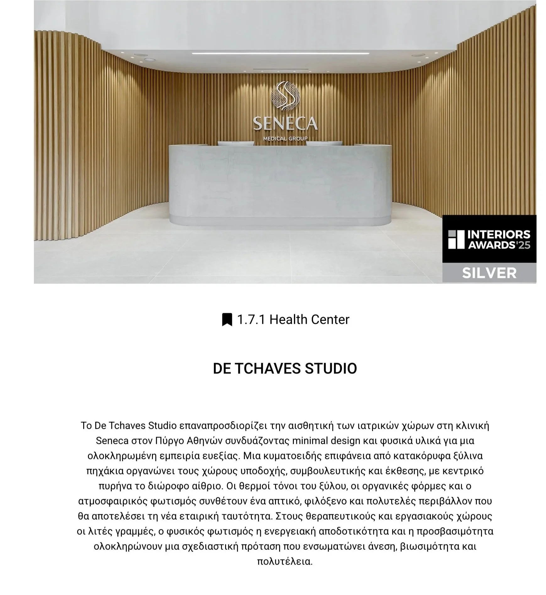 SENECA clinic in Athens has been awarded a Silver Award in the Health Center category at the Interior Awards 2025.