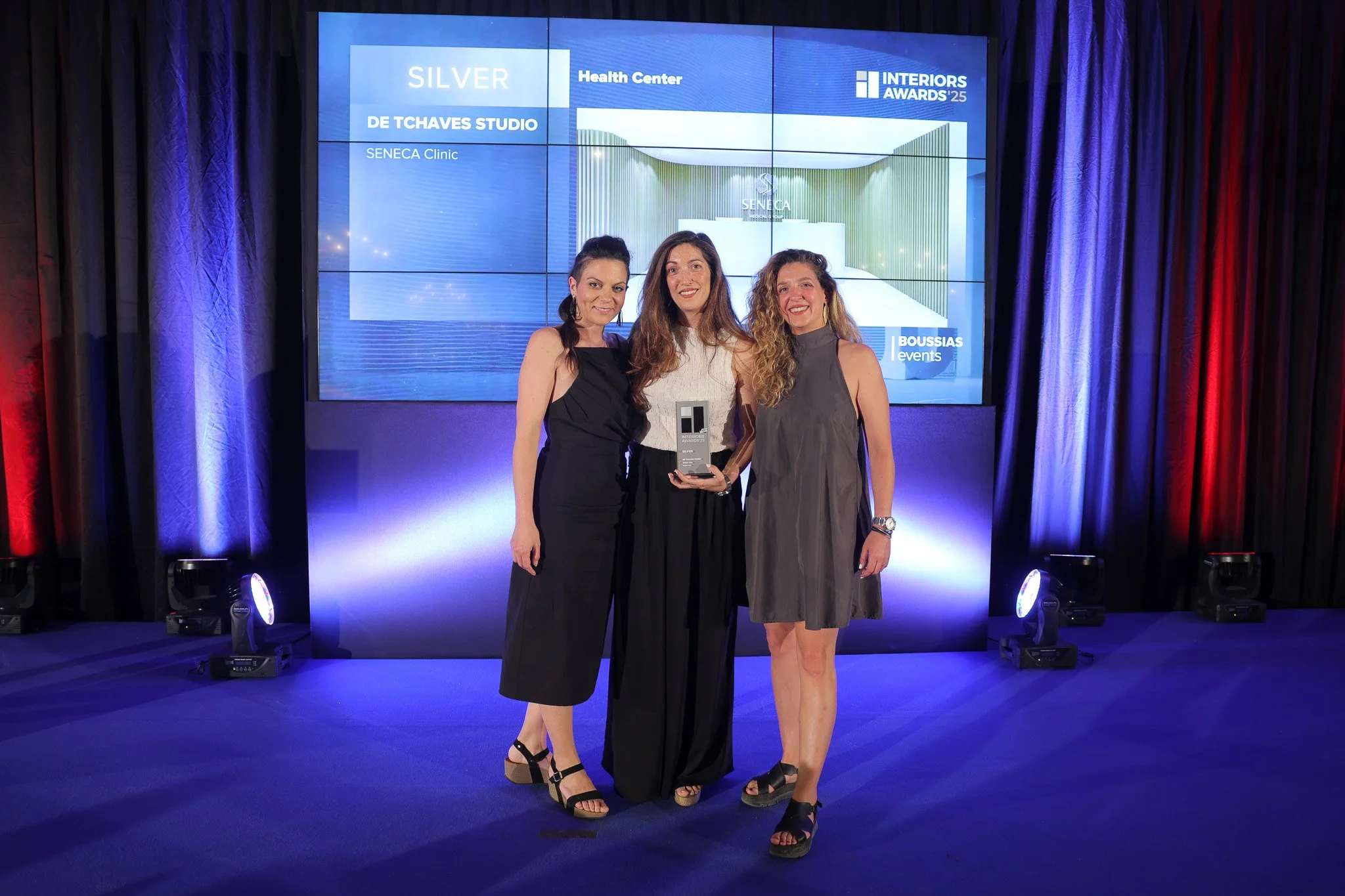 Marina Symeonidou, Ilia De Tchaves and Mikela De Tchaves receiving the Silver Award for SENECA at the 10th Interior Awards anniversary ceremony.